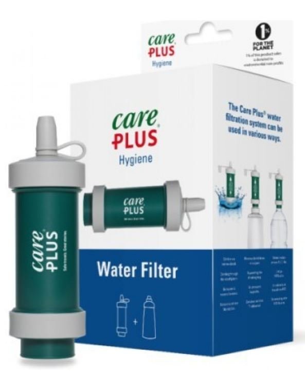 Vodný filter Care Plus® je nástroj na čistenie vody, vhodný na outdoorové aktivity a dlhšie pobyty. Membrána s pórami priemeru 0,1 mikrónov prečistí vodu od baktérií a jednobunkovcov s účinnosťou 99,99%. Taktiež zbavuje vodu blata a iných drobných častíc. Vďaka závitu ho možno pripevniť aj na pet-fľašu, alebo možno použiť pribalený rezervoár 1,0L.