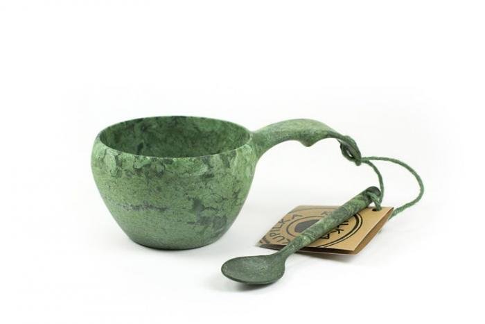 Hrnček v tvare tradičnej kuksy s lyžičkou, vyrobený zo špeciálneho materiálu Kareline®. Materiál je unikátny spojením vlákien z borovicového dreva a termoplastu v pomere 50:50. Spája výhody dreva a plastu. Je nerozbitný, znáša teploty od -30°C až do +110°C, je pevný a ľahký. Takisto neabsorbuje pachy z potravín, jednoducho sa čistí a nie je citlivé voči vlhkosti ako klasický drevený riad.