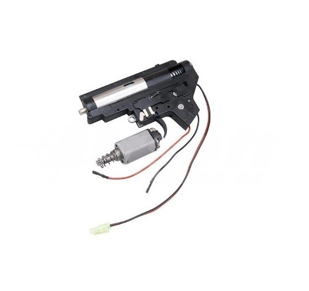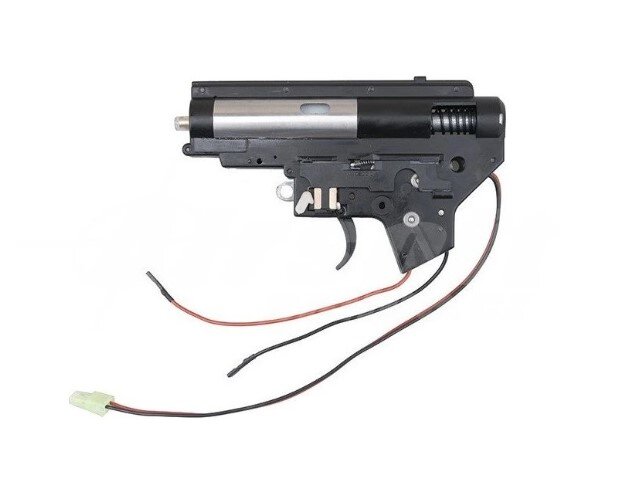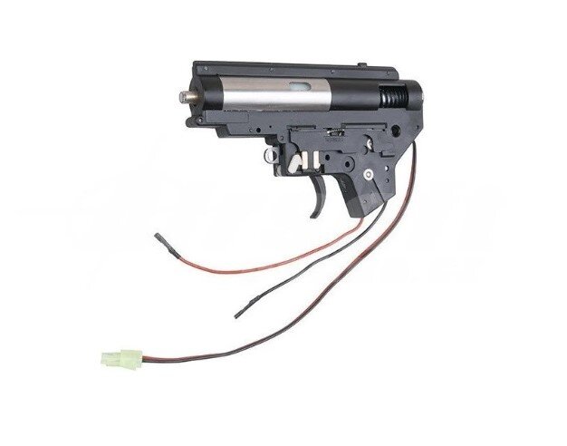 Kompletný mechabox typ 2. Zhodný, ako dáva firma Cyma do svojich nových zbraní M4. Obsahuje kovový tŕň s ložiskom, pružinu ekvivalentu M120, kovová 7mm ložiska..atd. Kabeláž je dlhá s vedením do predpažbia. Súčasťou balenia je aj motors dlhú oskou. Jedná sa o originálny diel výrobcu Cyma.
