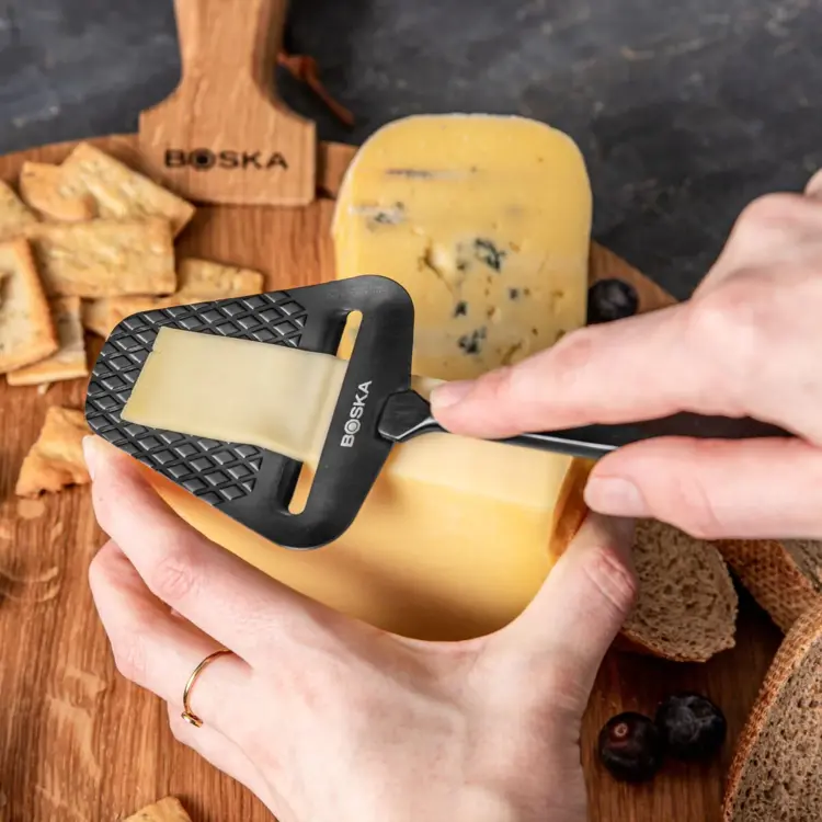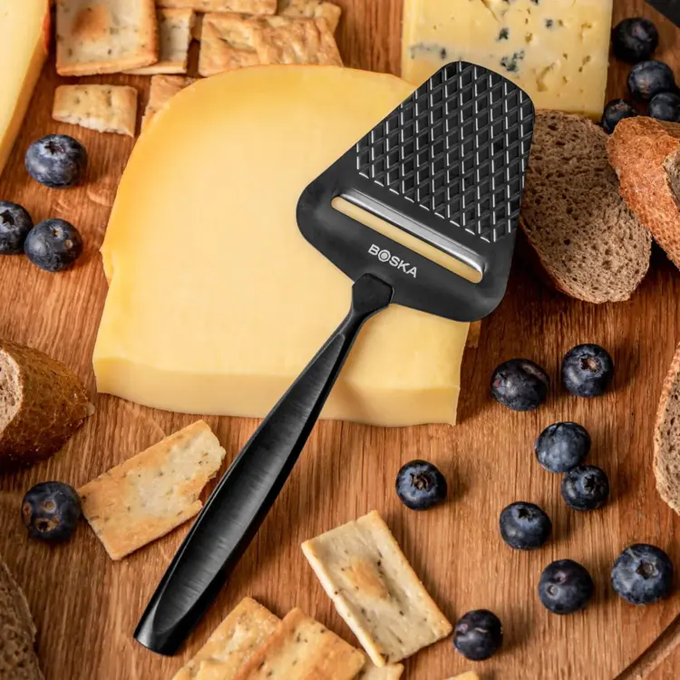 Vopred balené plátky syra budú minulosťou, keď budete mať tento čierny krájač syra. Pri vytváraní čerstvých plátkov syra sa syr okysličí, čo zintenzívni jeho chuť, rovnako ako víno. Patentovaná nepriľnavá úprava a prešívaný vzor zabraňujú prilepeniu syra počas krájania. Vďaka tomu je krájanie tenkých, chutných plátkov syra mimoriadne jednoduché.