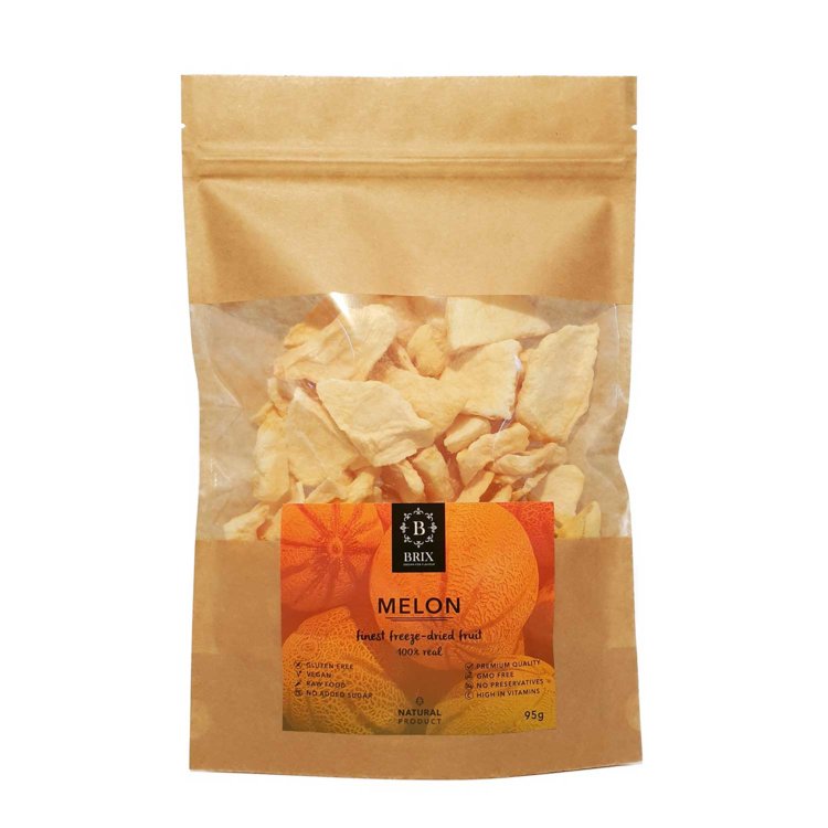 Zloženie 100% melón Cantaloupe dehydrovaný procesom lyofilizácie (proces sušenia mrazom).