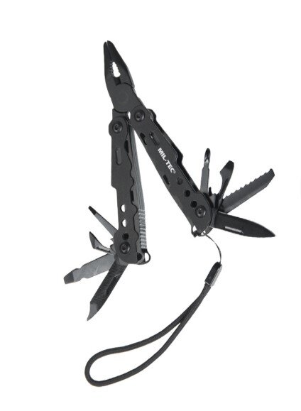 - kliešte, pilník, 2 ploché a 1 krížový skrutkovač, otvárač na konzervy, otvárač na fľaše, nôž, pílka
