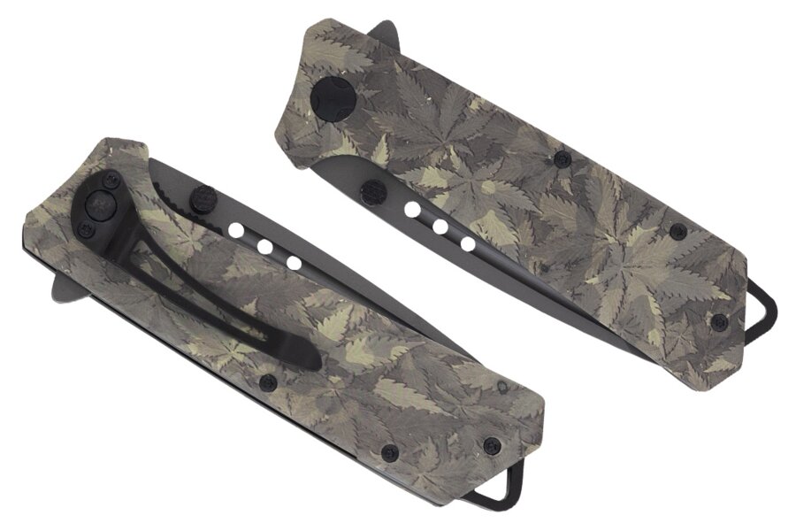 Tento predmet je zdobený jedinečnou maskáčovou potlačou z listov konope .