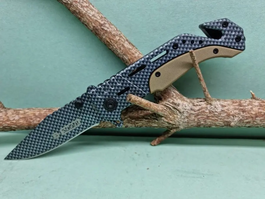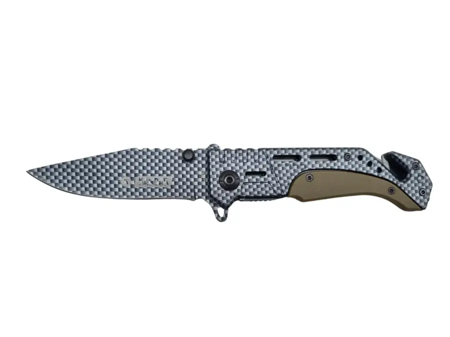 Vreckový zatvárací nôž Kandar s šedou 8,5cm nerezovou čepeľou. Kombinovanou rukoväťou plast/kov, rezačom na lano hrotom na rozbíjanie skla, poistkou a s asistenciou na otváranie jednou rukou. Na zadnej časti má klip na uchytenie na opasok. Celková dĺžka noža je 20,5cm.