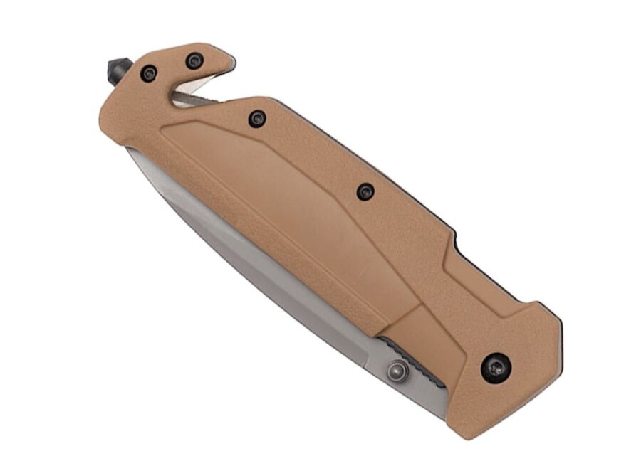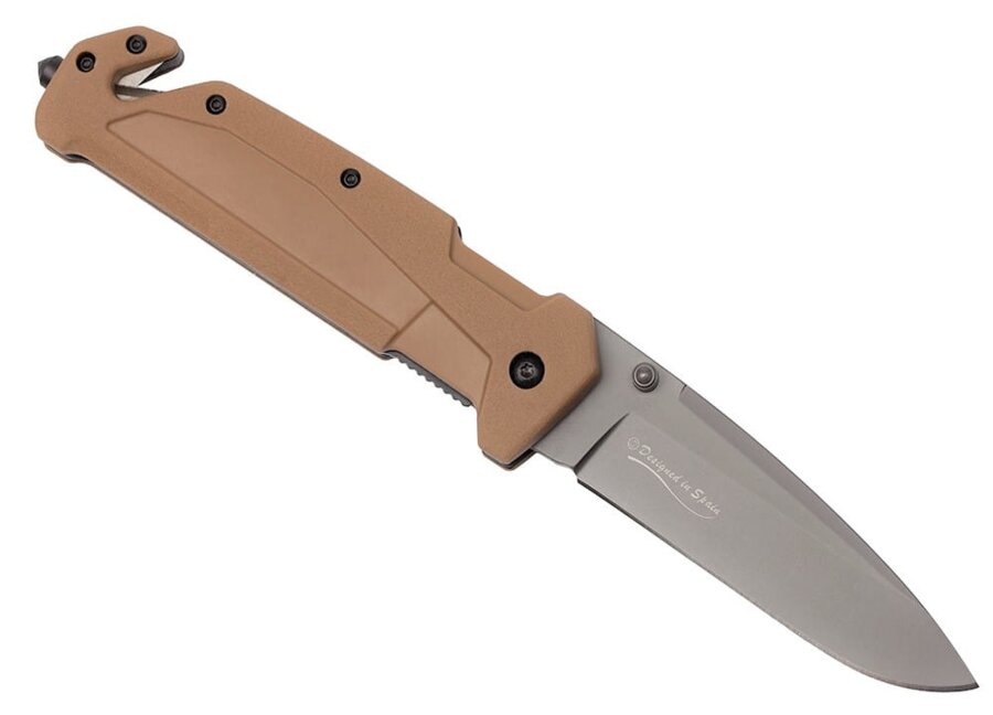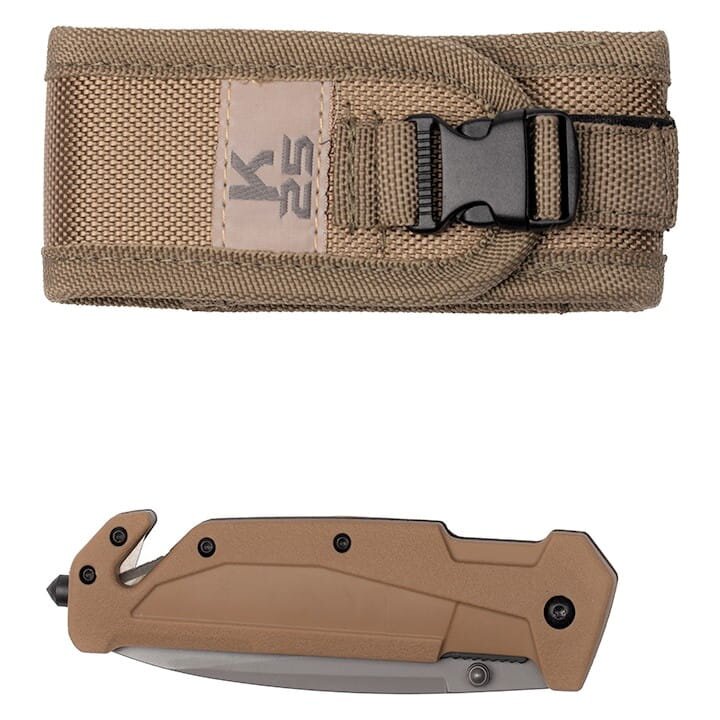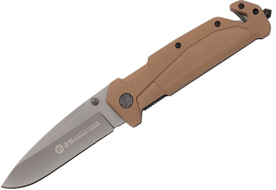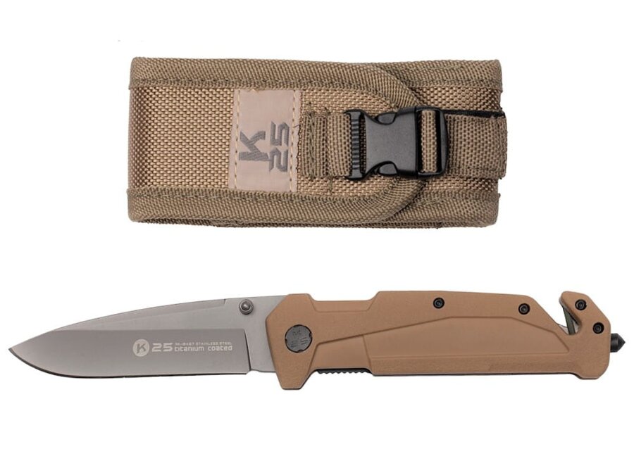 Spoľahlivý záchranársky nôž v púštnej farbe od slávnej španielskej značky K25 .