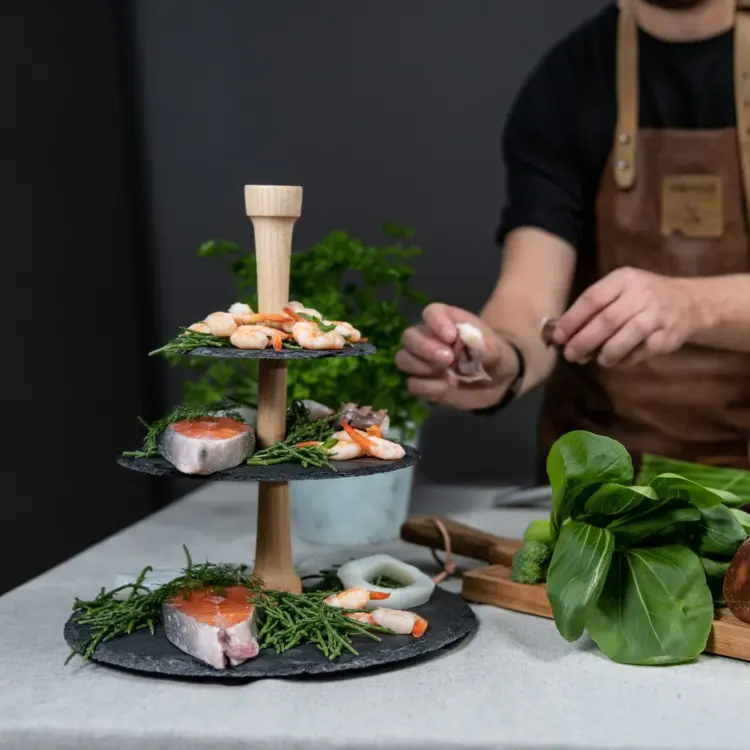 Party Tower® – ⌀ 30 cm je perfektný viacúrovňový servírovací stojan na elegantnú prezentáciu syrov, čokolády a iných predjedál. Kombinácia vysokokvalitných európskych dubových a bridlicových servírovacích dosiek robí z tejto servírovacej veže skutočný pútač pozornosti na každom popoludňajšom čaji alebo stretnutí. Vďaka trom úrovniam si môžete miešať a kombinovať rôzne lahodné pochúťky.