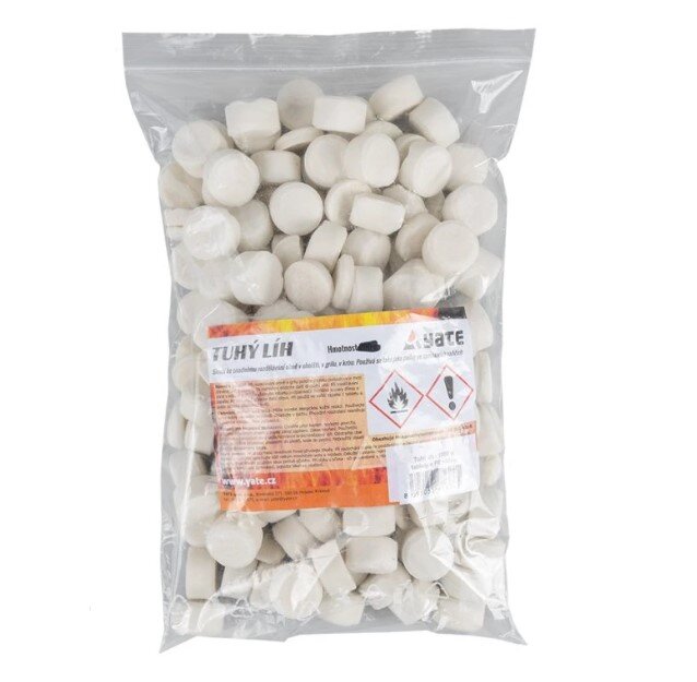 Veľké balenie, ktoré obsahuje rôzne poškodené tablety. Niektoré sú rozpadnuté, iné trochu oprýskané. Ide o poškodenie vzniknuté pri výrobe alebo manipulácii. Funkcia paliva zostáva neporušená, je stále stopercentná. Tablety je možné použiť ako palivo pre varič na tuhý lieh alebo na rozkurovanie kachlí, krbov a grilov. Na založenie ohňa obvykle stačí 1/2 tablety aj menej.