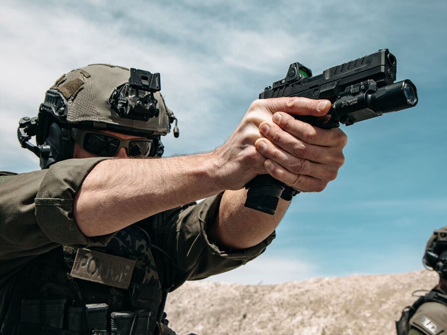 Echelon™ od Springfield Armory nastavuje nový štandard pre moderné pištole. Vysoko prispôsobivá modulárna platforma ponúka vynikajúcu ergonómiu a množstvo patentovaných funkcií. Centrálna prevádzková jednotka COG je úplne nezávislá, čo umožňuje jednoduchú výmenu medzi rôznymi veľkosťami tela zbrane v priebehu niekoľkých sekúnd. Precízne vyrobené šasi z nehrdzavejúcej ocele odolá aj tým najdrsnejším podmienkam a slúži ako robustné puzdro pre tento patentovaný systém. Revolučná montáž optiky so systémom variabilného rozhrania (VIS) umožňuje nainštalovať kolimátory rôznych značiek, bez použitia montážnej platničky. Jednoducho nakonfigurujte samosvorné kolíky do požadovanej polohy a máte k dispozícii montáž s maximálne nízkym osadením pre dokonale presné a intuitívne zacielenie. Echelon™ disponuje kovanou hlavňou i záverom s ochranným povrchom Melonite, poistkou spúšte, poistkou úderníka, indikátorom nabitej komory a obojstranným vypúšťaním zásobníka. Dodáva sa s dvomi zásobníkmi z nehrdzavejúcej ocele s kapacitou 17 a 20 nábojov. (ECHELON 3-Dot Tritium, 9x19, EC9459B-3D)