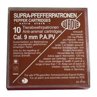 Pištoľový obranný slzotvorný náboj nemeckej značky Wadie pre plynové (expanzné) zbrane kal. 9 mm P.A. s koncentráciou 120 mg účinnej látky Nonivamid. Balenie obsahuje 10 ks. Dosah účinnej látky po výstrele je max. 3 až 5 metrov.