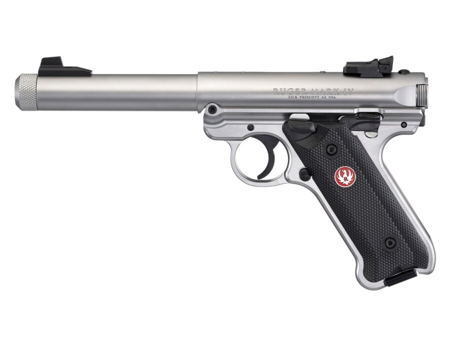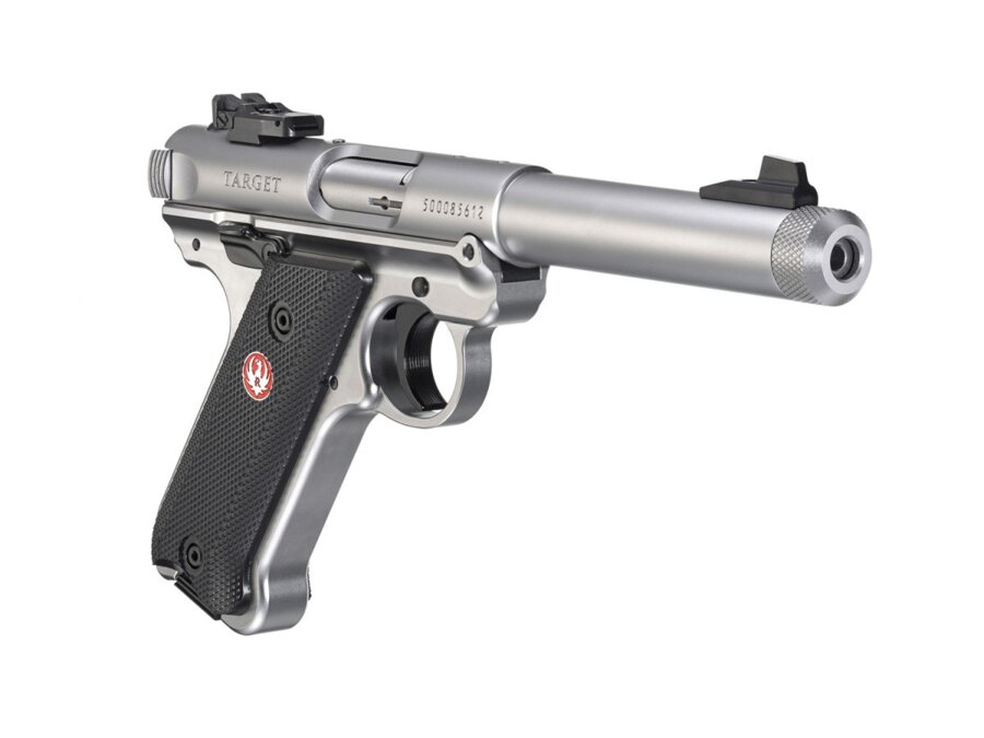 Pištoľ Mark IV Target 40126, kal. .22 LR, nerezová hlaveň Threaded Bull, dĺžka hlavne 5,5" (14 cm), celková dĺžka 24,8 cm, hmotnosť 1213 g, výškovo a stranovo nastaviteľný cieľnik, kapacita zásobníka 10 nábojov, v balení dva 10-ranové zásobníky, drážkovanie hlavne 1:16" pravotočivé, 6 drážok.