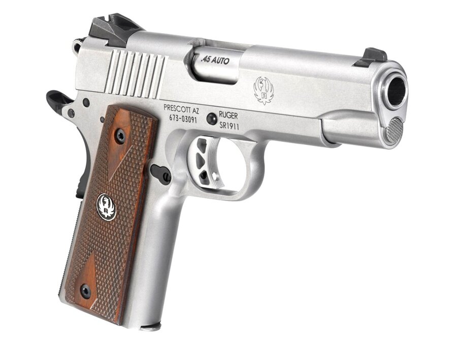 Ruger SR1911 Commander-Style 6702 je poloautomatická pištoľ kalibru .45 Auto v štýle 1911, známa svojou presnosťou a spoľahlivosťou. Má precízne spracovanie, hlaveň z nerezovej ocele a ľahkú hliníkovú konštrukciu tradičného dizajnu s povrchovou úpravou v matnom nereze s vymeniteľnými úchopovými panelmi z tvrdého dreva a kockovaním na chrbte. Skeletonizovaná hliníková spúšť poskytuje veľmi ostrý, ľahký stisk s rýchlym resetom. Ruger SR1911 Commander-Style 6702 disponuje manuálnou poistkou, úchopovou poistkou, indikátorom nabitej komory a skeletizovaným kladivom s titánový úderníkom. V balení 2 ks zásobníkov z nerezovej ocele.