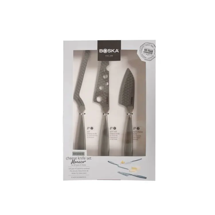So sadou nožov na syr Monaco+ máte to najlepšie z oblasti nožov na syr. Do tejto série bolo vložené viac ako 120 rokov skúseností. Nože Monaco+ vám poskytujú najlepšie riešenia na krájanie syra. Či už máte krémový Brie alebo tvrdý Parmesan, s týmito nožmi z nehrdzavejúcej ocele si poradíte s každým druhom syra. Toto je dokonalý darček pre skutočných milovníkov syra a domácich kuchárov.