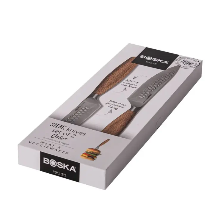 Premeňte každý okamih pri stolovaní na niečo výnimočné so steakovými nožmi Oslo+. Táto sada dokonale kombinuje funkčnosť so štýlovým dizajnom, vďaka čomu je ideálna pre tých, ktorí oceňujú kvalitu. Dva steakové nože z nehrdzavejúcej ocele umožňujú bezproblémové krájanie mäsa, rýb a zeleniny, či už v kuchyni alebo pri stole.