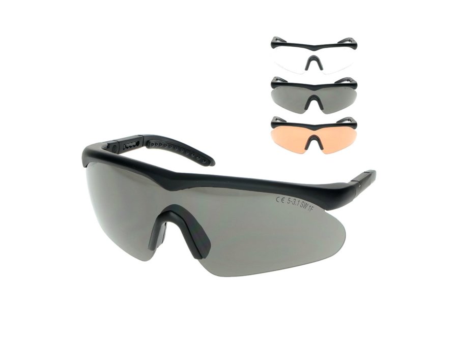 Súčasťou balenia sú 3 sklá: šedé, oranžové a bezfarebné. Okuliare majú nastaviteľnú dĺžku straníc a nastaviteľný uhol straníc. Povrch okuliarov je odolný proti zahmlievaniu a poškriabaniu. Sklá poskytujú ochranu pred UVA, UVB a UVC žiarením až do 400 nm. Okuliare spĺňajú normy EN 166, STANAG 2920*, ANSI Z87.1**, EN 12312-1. Súčasťou balenia je aj mikrovláknové vrecúško. Odnímateľný klip adaptér pre zasklenie dioptrickými sklami, ktorý nie je súčasťou balenia, je možné doobjednať. Z výsledkov testovania vyberáme: *Sklom neprenikne štandardiz. projektil kal. 3,60 mm s hmotnosťou 0,325 g pohybujúci sa rýchlosťou do 236 m/s s energiou do 9,1 J. **Sklá odolajú nárazu oceľovej guličky s priemerom 6,35 mm pohybujúcej sa rýchlosťou 45,7 m/s.