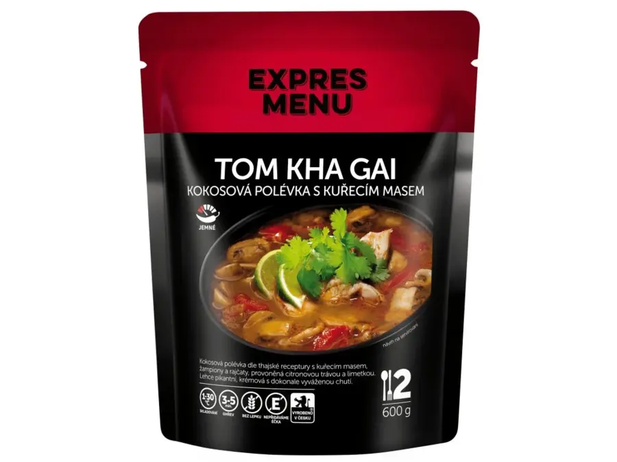 Kokosová polievka podľa thajskej receptúry s kuracím mäsom, šampiňóny a rajčinami, prevoňaná citrónovou trávou a limetkou. Ľahko pikantná, krémová s dokonale vyváženou chuťou.
