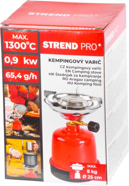 Kempingový varič Strend Pro 1002B je určený na tepelnú úpravu pokrmov vo vonkajšom alebo dobre vetranom prostredí. Skvelý na kempovanie, rybárčenie, piknik či chatárčenie. Maximálna teplota horáka dosahuje 1300 °C. Varič sa používa len s prepichovacou kartušou s obsahom 190 g plnenou propán-butánom, ktorá vyhovuje EN 417.