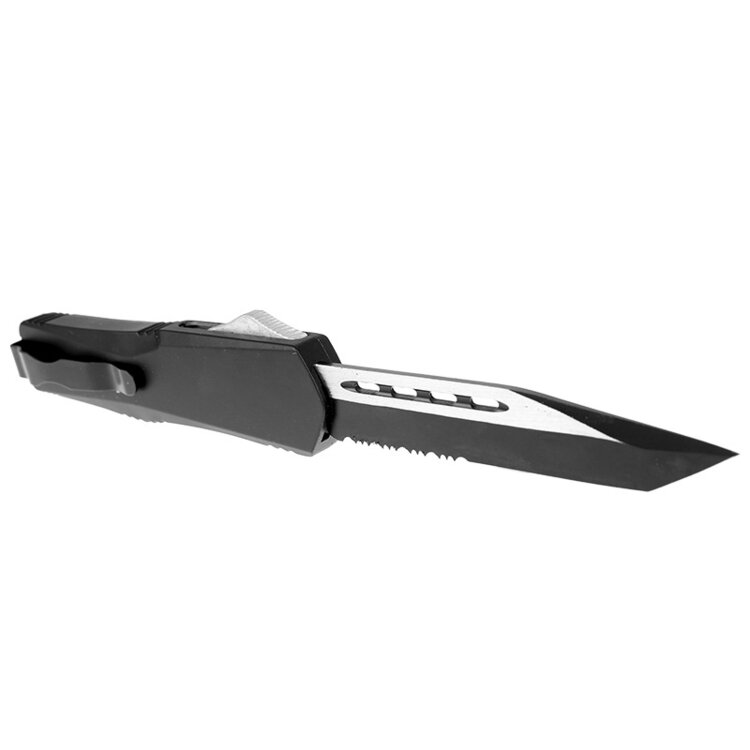 Tento prvotriedny vystreľovací nôž OTF si zamilujete vďaka jeho elegantnému dizajnu ako aj kvalitnému spracovaniu. Jedná sa o čierny vyskakovací nôž s čepeľou z nerezovej ocele, ktorá instantne vystreľuje z rukoväte vďaka funkcií OTF (out-the-front). Čepeľ bola navyše doplnená o čierny ochranný náter, ktorý zabraňuje vzniku korózie či neúmyselnými svetelnými odleskami.