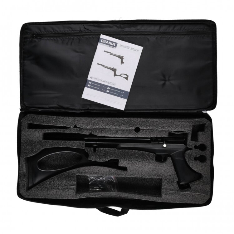 Ergonómia pušky Bandit Black zaručuje pohodlie aj pri dlhých streľbách: odnímateľné predĺženie pažby umožňuje prispôsobiť si dĺžku zbrane a vylepšená spúšť Diana ( DIT ) poskytuje krátky a čistý reset a vynikajúci pocit pri streľbe. Manuálna poistka , nastaviteľné mikrometrické budíky a priložený zásobník s puzdrom zvyšujú praktickosť - je to vetrovka, ktorá je pripravená na akciu hneď po vytiahnutí z puzdra, ideálna pre začiatočníkov aj skúsených strelcov.