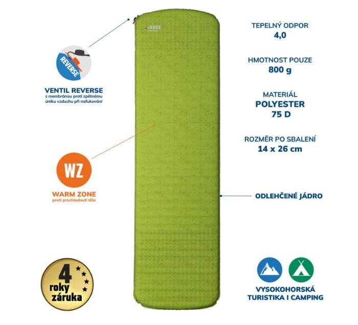 Na tento produkt sa vzťahuje predĺžená záruka (4 roky). Viac v obchodných podmienkach. Karimatka je dodávaná s prepravným obalom a sadou na opravy. Vrecko na sadu na opravy je vo vnútri obalu, aby nedošlo k jeho poškodeniu alebo strate.