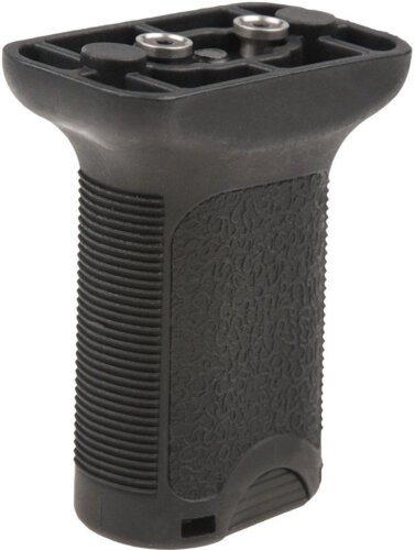 Vertikálna predná rukoväť vyrobená z odolného polyméru ponúka stabilný a pohodlný úchop vďaka svojmu špecifickému umiestneniu ruky, ktoré je dosiahnuté pomocou tvaru. Rukoväť je dutá s gumenou chlopňou na spodku, vďaka čomu sa do nej dá vkladať drobné príslušenstvo alebo menšie batérie.